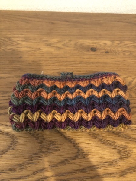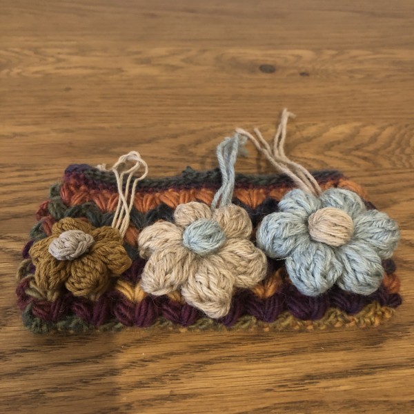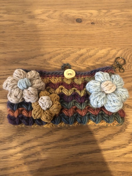 グラデーションウールでハート模様のポーチを編みました。お花のモチーフは取り外せるように毛糸で結んでいます。ブローチ式にするか思案中。