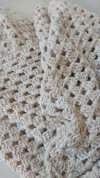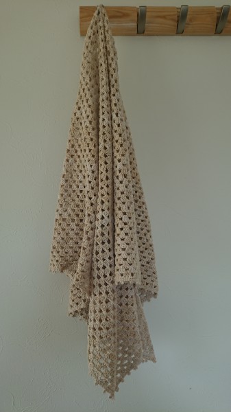 | シンプルなグラニースクエアの三角ショール 短い二辺だけピコットで縁編み ベージュ系のムラ染め糸を使いました こんなもんかな~と様子を見ながらのアミアミ 後半、編んでも編んでも進まなくなって心が折れた… 編み上がってから1か月ほど放置してましたが、先ほど糸始末を終わらせて無事完成。 |