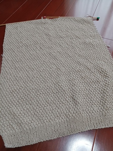 | 全体は鹿の子編みでシンプルに、大きめの襟を特長にしたセーター、ようやく完成しました。 ライトの違いで別物みたいな写真になってますが、色はベージュです。 今回、行き当たりばったりで編み始めたので、いろいろ迷走しましたが、何とか満足できる物になりました。 編み目の確認とバランスは大事ですね。 |