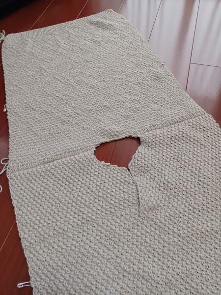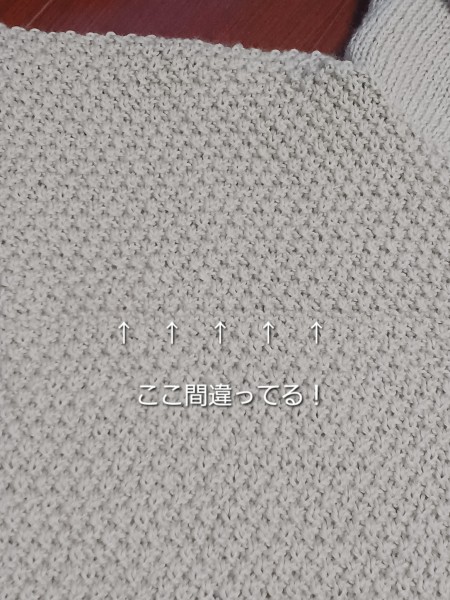 袖を付けてみたら、袖ぐり狭すぎてバランス悪いし、前身ごろに編み間違いを発見!!