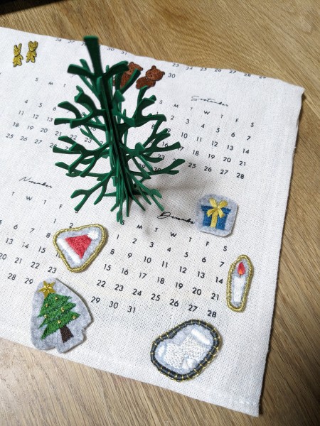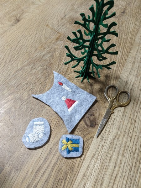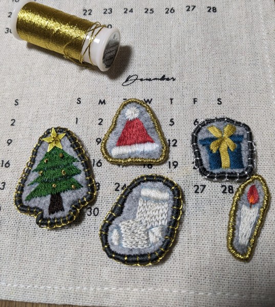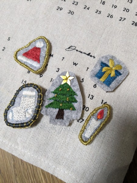 | 余りフェルトで何となく作り始めたツリーの刺繍から、クリスマスのピアスを5つ作りました。 Aonecoさんのクリスマスモチーフ刺繍図案が合いそうだったのでダウンロードして刺繍しました。5種類のピアスにしました。 |