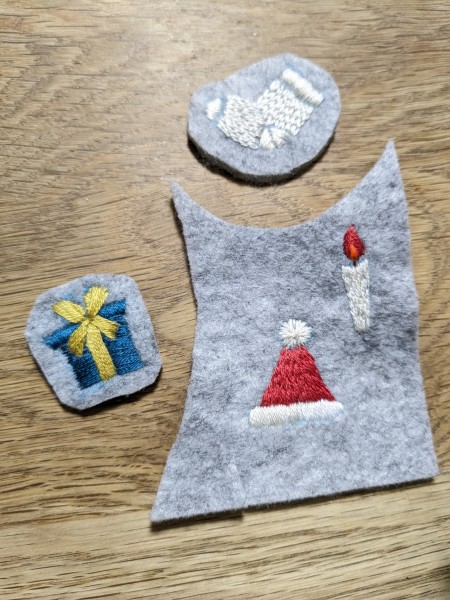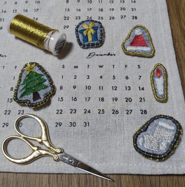 aonecoさんのクリスマスモチーフに似ていたのでダウンロードして付け足しでロウソク、帽子、プレゼント、靴下も刺繍しました