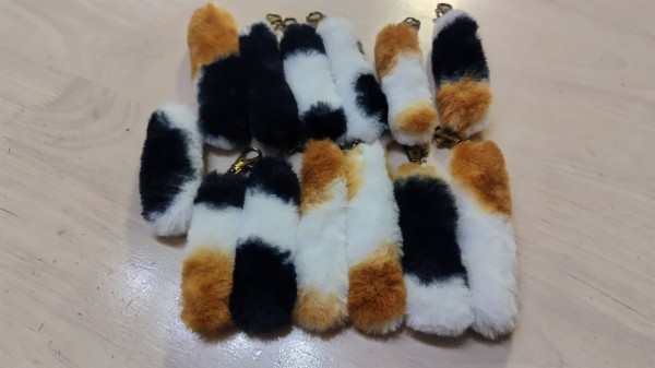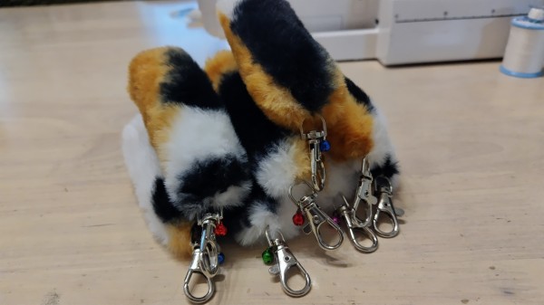 三毛猫生地で猫のしっぽキーホルダーを作りました。少ない生地で作れるので楽しくてたくさん量産しました( ΦωΦ )