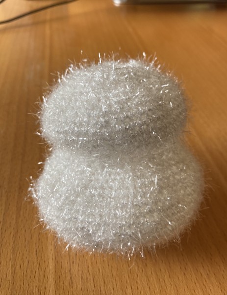 イルミネーションのスイッチ(単三電池)を隠したくて、雪だるまを編んで被せてみました。大と小2つの雪だるまを作成。目見当で合った大きさにするのに試行錯誤。