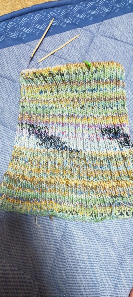 友達からの依頼でおしりから胸の下まである長〜い腹巻きを作ってほしいとのこと。 opalのいろんな柄の毛糸玉を2本取りして分厚くて面白い柄の腹巻きを作ってます。