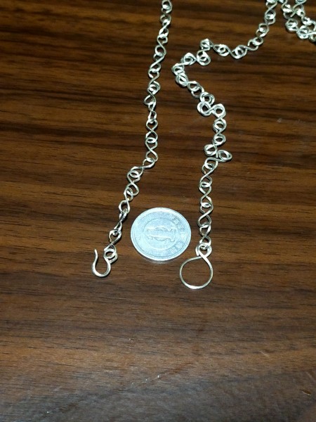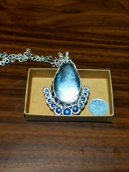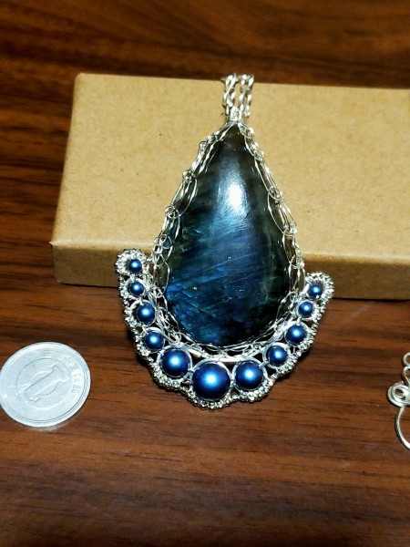 | ペンダントトップの習作。ワイヤーをバイキングニッティングという技法で編んでカボションを包んだペンダントです。 チェーンや留め具もワイヤーで制作。 |