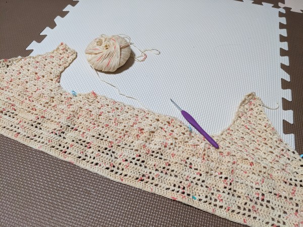 モチーフを繋げたカーディガンを編みました。長い道のりでした…。 地道にモチーフを編み、繋ぎながら大きなパーツを作り、さらにそれを繋げてから、棒針で裾・襟・袖口を編みました。 棒針は裾と襟に4号輪針60㎝、袖口は4号4本針を使用しました。二目ゴム編みです。