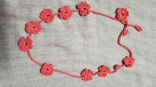 タティングレースのモチーフです。ビーズが入ってキラキラします。落ち着いた色の糸で作成しました。
