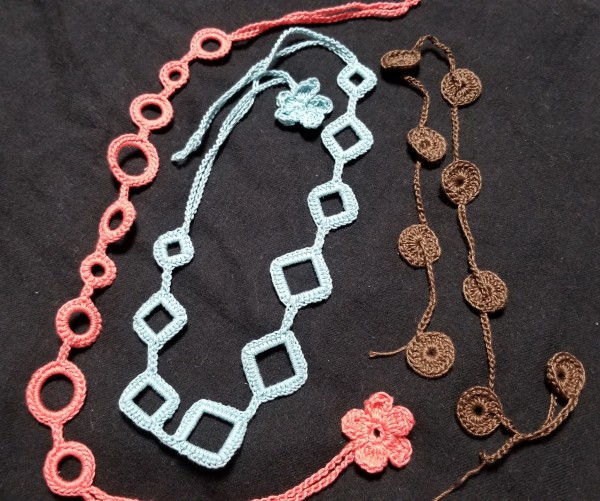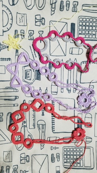 くるみボタンにタティングレースで作った小花やモチーフをつけてヘアゴムを作りました。