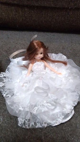友達のおこさんへプレゼントに縫いました。「リカちゃんの着せ替え ウエディングドレス」を参考に作りました。 本では、肩ひもはオーガンジーのリボンでしたが、三巻押さえがうまく使えなかったのでオーガンジーを断念し、市販のリボンに変更しました。 プレゼントしたら、喜んでくたれたのでよかったです。