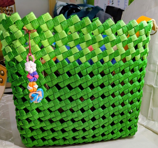 ・クラフトバンド12本幅で 四つだたみの小さいバックを 作りました。 ・2/4 取っ手を丈夫に手直しです。クラフトバンドで花結びのキーホルダーも付けました。