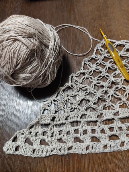 初めての七宝編みです。斜めに編み進んでショール風のカーディガンにま仕立てるつもりです。