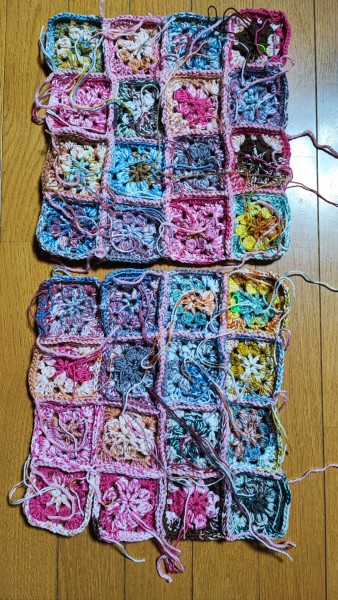 モチーフ編み。 あまり糸のDAISOポストカードを2本取りで編んでます。 色の変化が楽しくて飽きずにコツコツ。 YouTubeモコタロウさんの段染めで簡単可愛いモチーフを参考にしています。