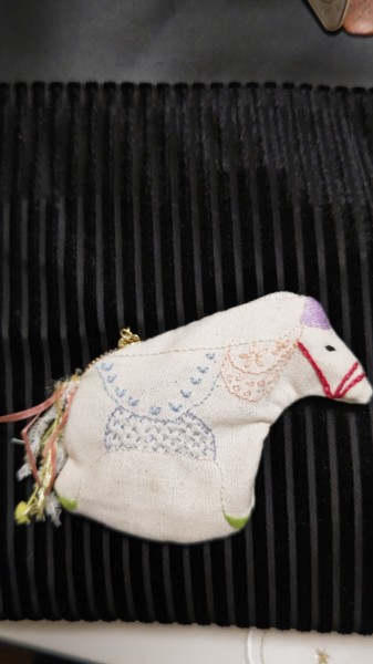 盛岡の伝統チャグチャグ馬コからインスピレーションを得たポーチです。馬の輪郭を強調するなら、ぬいぐるみにしたほうがよかったのか、装飾のヒラヒラは沢山つけたかったけど刺繍の良さが無くなるのでシッポだけ、など葛藤多かっただけに出来上がると可愛いです。