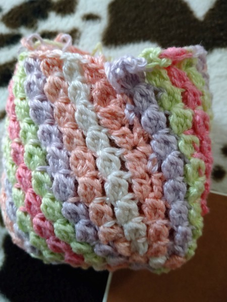アクリル毛糸のたわし。くさり編み、細編み、うね編みで作りました。 写真にあるように平行四辺形に編んで、筒状にはぎ合わせて、端をギュッとしぼって完成。 色を変えれば、ドーナツにもなるようです。