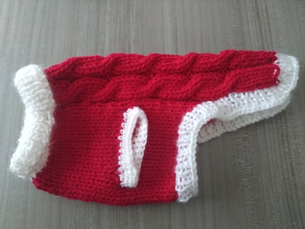 クリスマスを意識して、色を白と赤にしました。 頭からかぶれるようにゆったりめの首もとにして、ミシンゴム糸を通しました。 背中側は縄編です