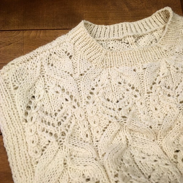 アラン模様のセーターです。 模様集から選んでアレンジしています。 糸が細めだからか、模様をたくさん入れた割に軽く仕上がりました。