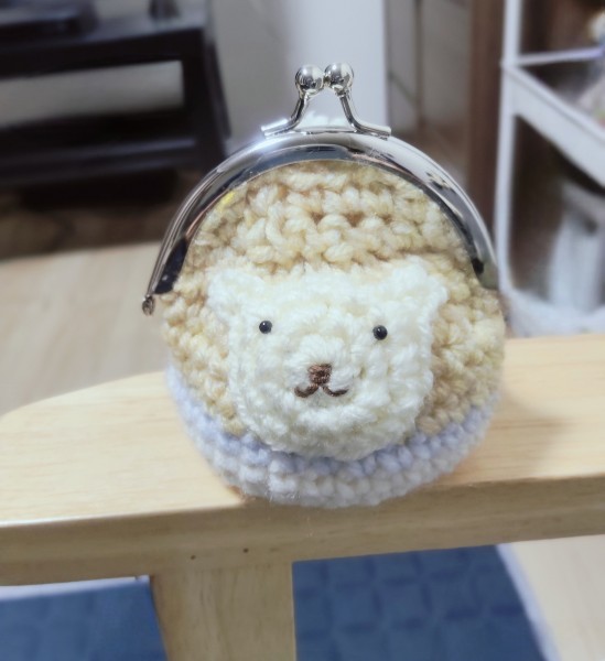 以前ダイソーで購入していたがま口があったので毛糸でポーチにしてみました。出来上がりが寂しかったのでくまちゃんを付けました。後ろはしっぽに見たてたポンポンです。