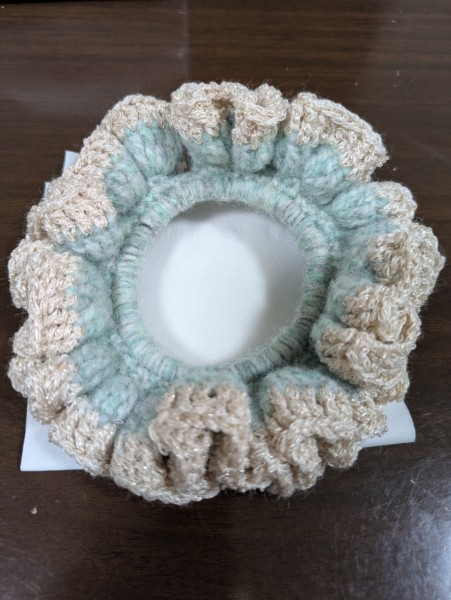 メランジのミントグリーンの毛糸と、ゴールドラメの並太毛糸でフリルシュシュを編みました。 あまりフリルがもこもこしないように、少し小さめのかぎ針で編みました。