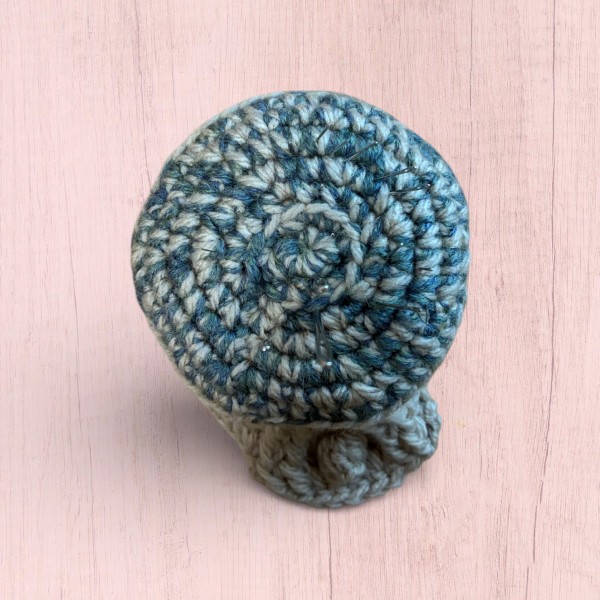 あみぐるみの顔。 紫色の目にしました。上の餅と、下の餅の大きさのバランスを考えました。