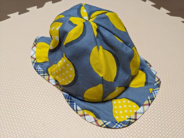 息子用の日除け付き帽子。裁断して寝かせること1か月…ようやく完成させました。サイズテープとやらを初めて使いました。家にある布で作ったのでこれのためにかかった材料費はサイズテープ代くらい。