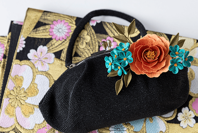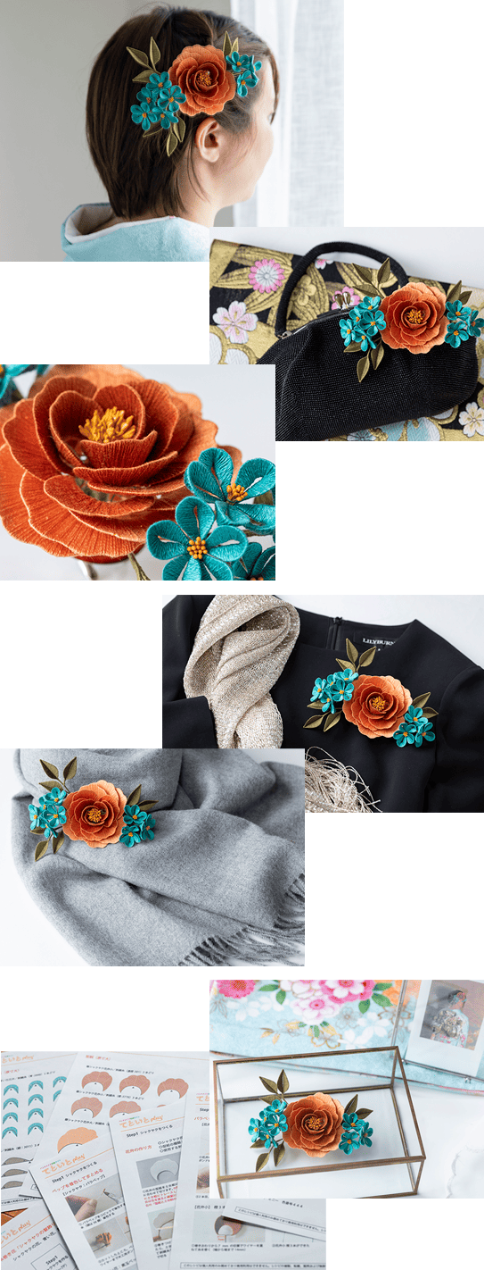 大切な日の、晴れやかな表情をさらに明るく彩る「髪飾り」。着物や帯の色に合わせた誰も持っていない自分だけの髪飾りを作りませんか?糸まき花は紙と刺繍糸で制作しているので、大ぶりで華やかなのに軽量で着け心地が良いのが特徴です。種類も色数も豊富な刺繍糸から、お気に入りの糸を選んでお着物に合わせた髪飾りをつくるのも素敵ですね。パーツの組み合わせをアレンジして、さらに自分らしい作品も作れますよ。
