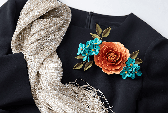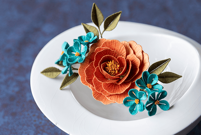 オフフープ(R)立体刺繍作家PieniSieniさんのデザインです。作品づくりの楽しみをお聞きしました。「型紙を縮小して数を調整すればブローチなどにも応用できますし、金具をバレッタやポニーフックにしても楽しいです」「糸まき花は手芸に興味を持っていてもなかなか取り組めなかった方の第一歩に最適な技法。つまみ細工との相性も良く、布花など他ジャンルのクラフトと一緒に楽しんでいただけると思います」