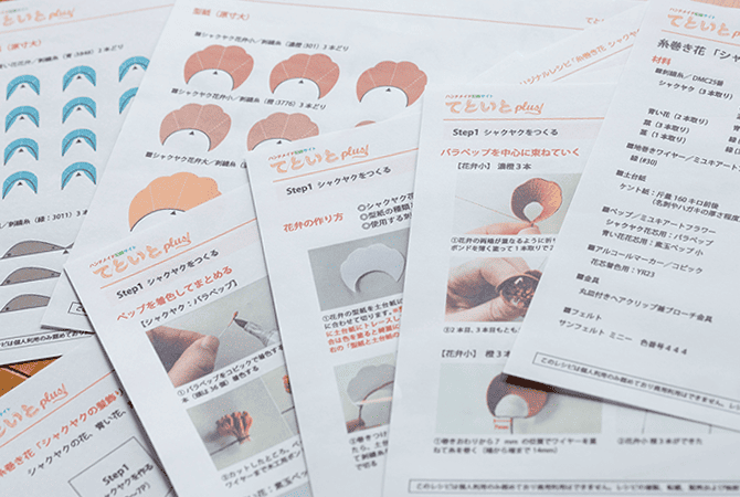 花弁の土台紙にワイヤーを貼り付けて刺繍糸を巻くだけ。立体刺繍のような作品づくりを、糸まき花は針を使わず手軽に楽しめます。シャクヤクの花弁は糸のヨリを取りながら丁寧に巻き、花弁が小さな青い花は紙に巻く糸の角度に気を付けながら、慣れるまではゆっくり巻きましょう。「ボンドはつけ過ぎない」「型紙の土台紙を切る時は、ハサミではなく土台紙を動かして一気に切る」などのポイントを押さえてお楽しみください。