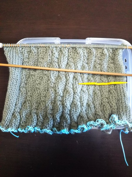 自分サイズのベスト。サイズがXLなので指定より2号+の針で緩く編んでるところ。ゲージを取ったのはいいけどもはじめてのウエア作成なので模索中。