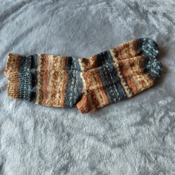 「maffonのニットで作るジャガードソックスパターン(型紙)メンズサイズ26cm~28cm」の26cmで制作。 柄合わせに失敗。 5mmの縫い代だとほつれが怖いので、スパンフライスニット生地を使用したかかと・つま先・吐き口はジグザグミシンで端の処理をした方が良さそう。 履き心地はつま先の縫い目が気になるので、市販品の方に軍配が上がるかな? 丈感やスパンフライスニットの吐き口などは個人の足サイズに合わせて改良の余地あり。