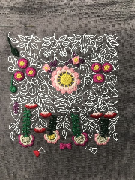 樋口愉美子さんの図案でバッグを作りました。 余白はきのこリースを邪魔しない様に引き立てる様に、生地と同色の刺繍で埋めました。
