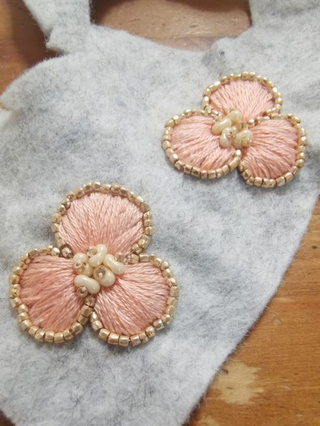 キレイなピンクの刺繍糸でピンクのお花を刺してみました。やっぱり、耳飾りかな,,,。