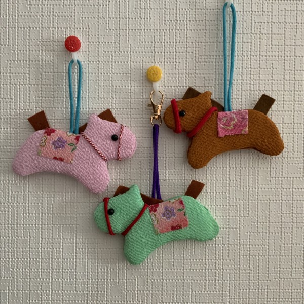 視覚障害の方の手芸教室の馬のストラップ大2弾、色を変えて、より作りやすさを追求して出来上がった作品です。視覚障害の方がボンドで手がベタベタになってしまうのを解消するため、両面テープシートを使用してみました。これがとてもうまく行って、とても簡単にできるので、そのうちyoutubeに作り方をアップしようかなと思っています。色もピンクや薄グリーンは馬に見えないかなと思ったんですけど、逆に華やかになった気がします。色は選んでもらおうと思います。視覚障害の方も様々で、全盲の方にしても昔見えていらっしゃったらその記憶の中で色を選ばれるのを楽しまれるんです。