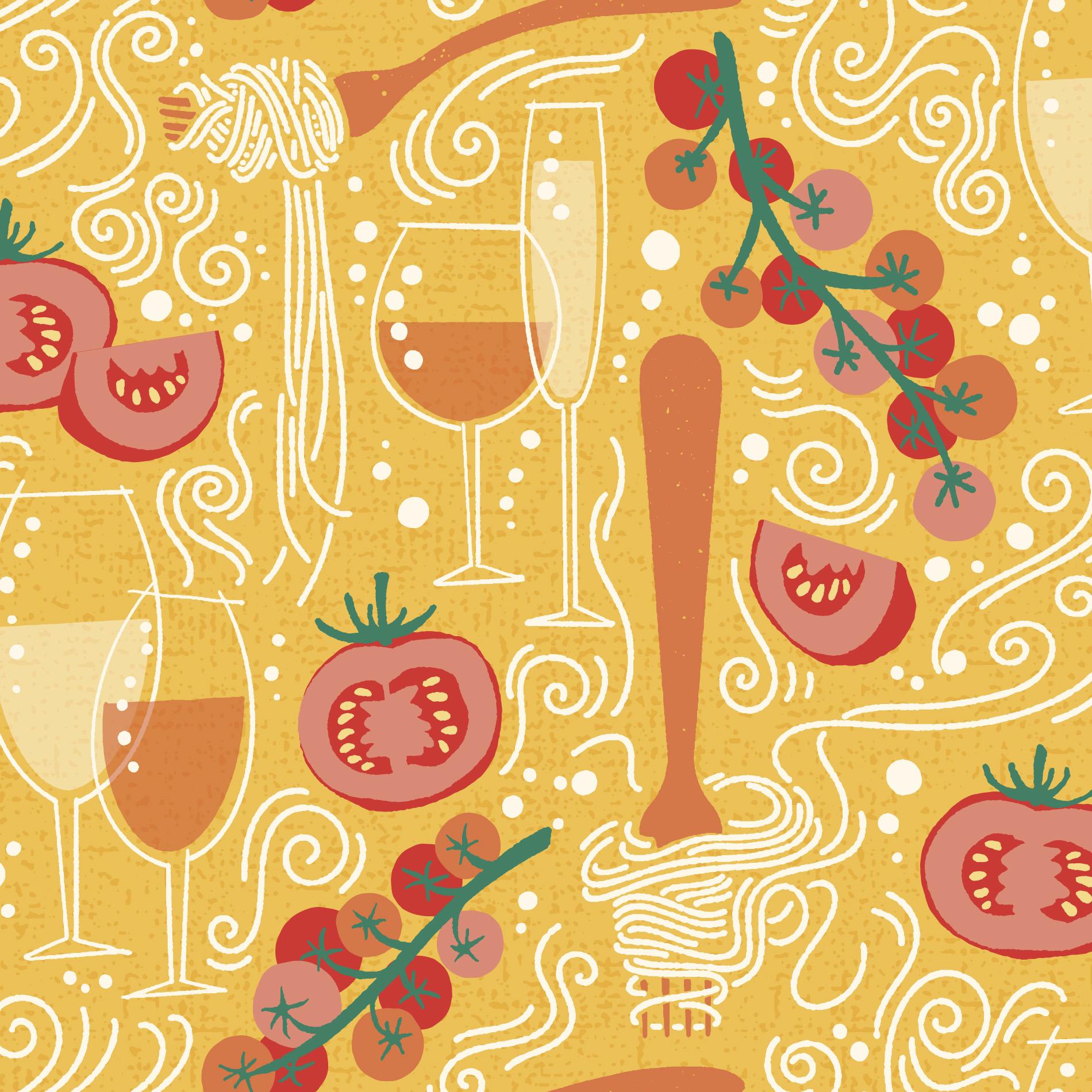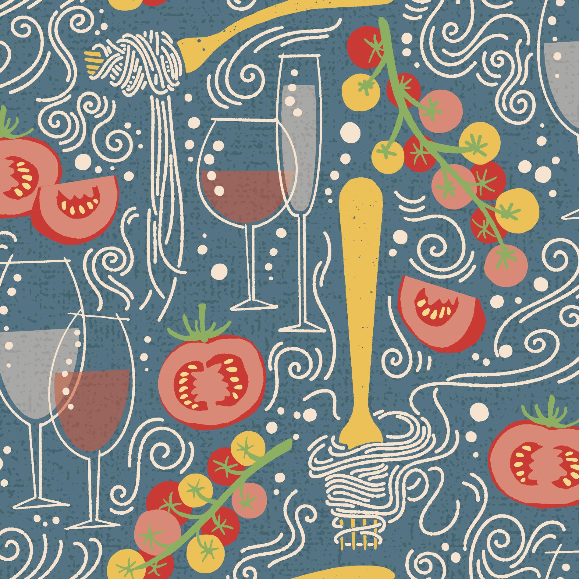 パスタ、ワイン、トマトなど、イタリアンディナーの主役たちが登場する楽しいデザイン生地です。