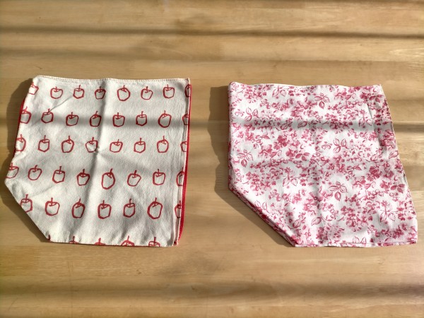 かまわぬの手ぬぐいのあずま袋と同じタイプのマチのある弁当袋を作ってみました。りんご柄2色のがお見本です。先ずは一枚布で作ってみました。 ミシンの三つ巻押さえを初めて使いましたが、縫い代がすっきりと仕上がりました。