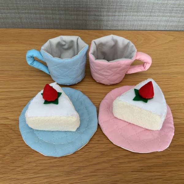 母子生活支援施設で、縫い物が苦手なお母さんたちにお子さんもおもちゃを作ってもらうための講座の作品です。 中にスポンジを入れて、周りはタオル(パイル)を巻いて、上にフェルトを貼ってます。 バターはフェルトを重ねてボンド、クリームは極太ロープを固結び。 お皿は中に厚紙を入れてますが、ここだけ、上を立ち上げるためになみ縫いをして絞ってます。お皿はコットンで挟んでいて、裏表別の布を使用しているので、リバーシブルです。