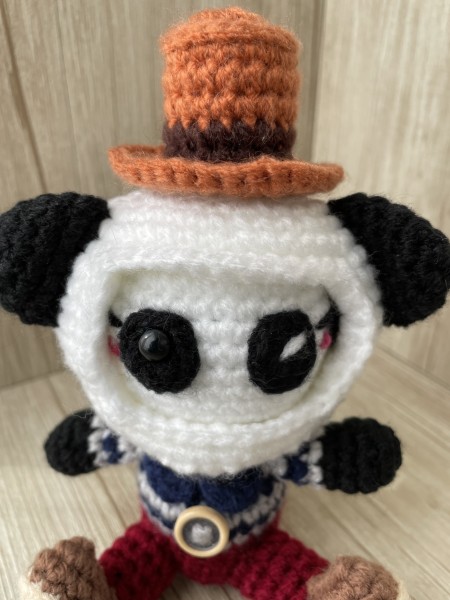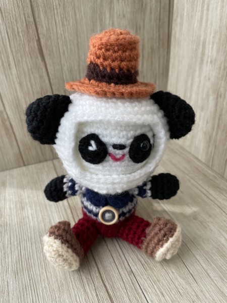 パンダの顔が変わるあみぐるみです。頭の帽子を回転させると、3種類の顔に変わります。