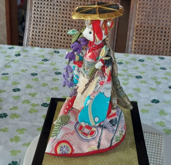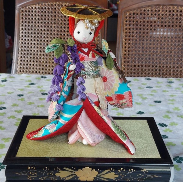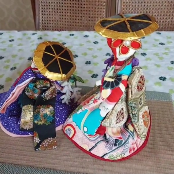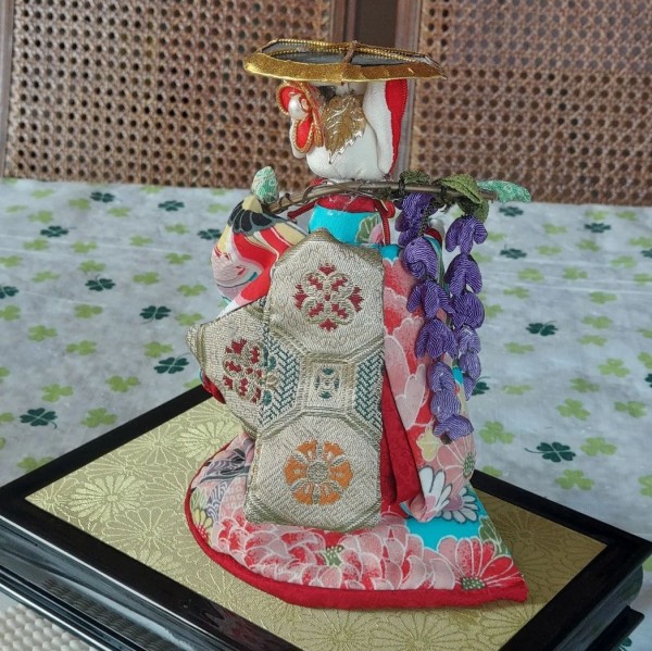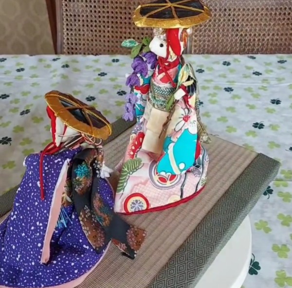 美しい柄の一越ちりめんを手にして、思い浮かんだ藤娘。姉を作ったら妹も作りたくなりました。笠や藤にもこだわってみました。