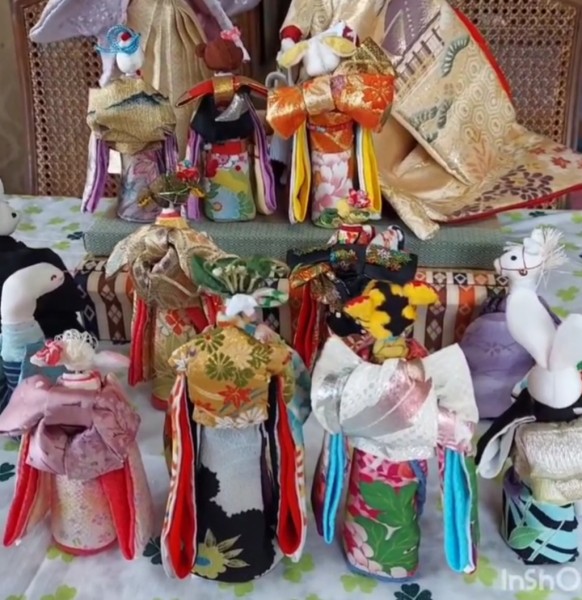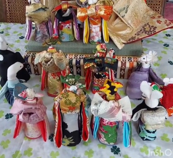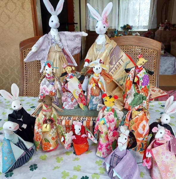 うさぎの結婚式に、うさぎの両親と十二支のお人形を列席させたいと思いました。帯の結び方やバッグもそれぞれ変化をもたせました。