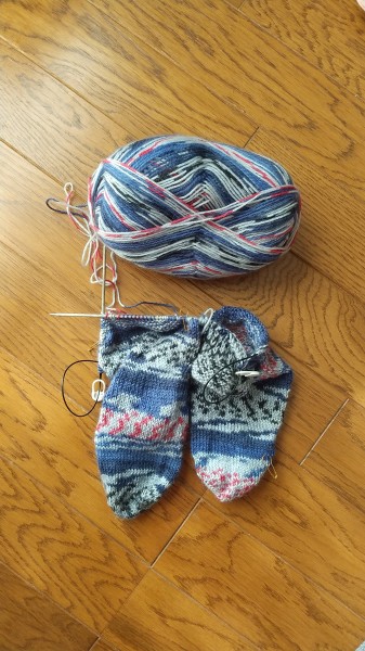 途中で違うものを編んだりして時間がかかってるけど、踵編みに入った。