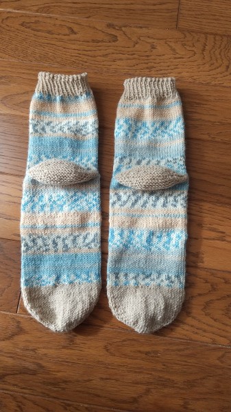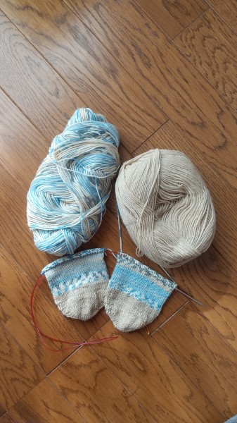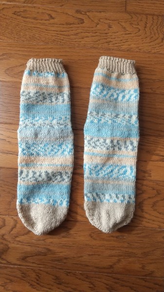 つま先を単色で編み終わり、段染めに替えて、続きを編み編み中。