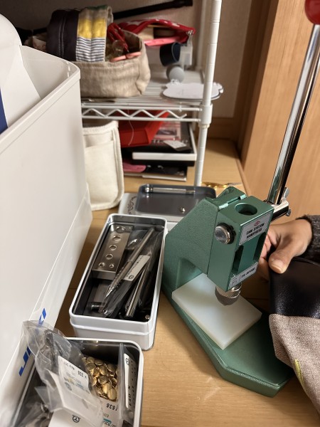 バッグ底に鋲を打ってみました。誰も持ってないだろうマニアックな道具を使いました。これはリサイクルショップで以前購入した中古の穴あけポンチ。でも、ちょっと工夫するとカシメとかホックとか色々取り付ける事出来るんです。最初、失敗続きの試行錯誤の途中に気持ちがめげて、純正のハンドプレス機も買ってしまった私ですが町工場のようにモノづくりを楽しんでいます