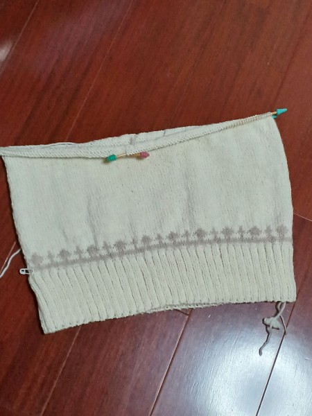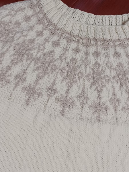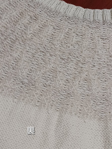 編み図にはありませんでしたが、裾にも模様編みを入れてみました。アイボリーにベージュで編んでいるので、主張しすぎず、メインの模様の邪魔にはならないかな、と。