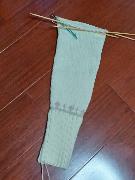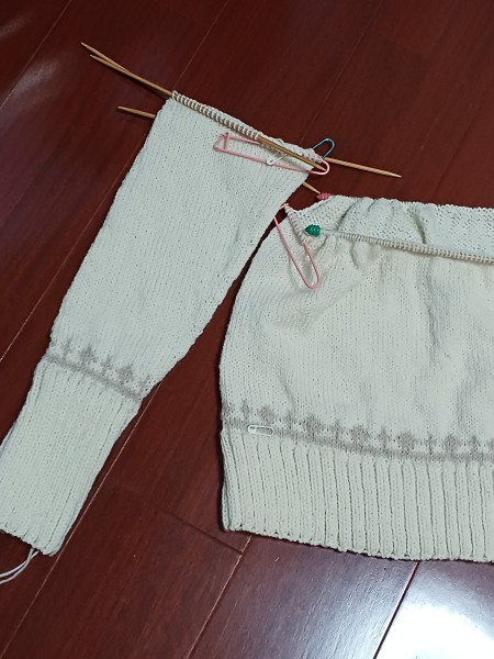 片袖まで出来ました。袖口のところにも、模様編み入れています。
