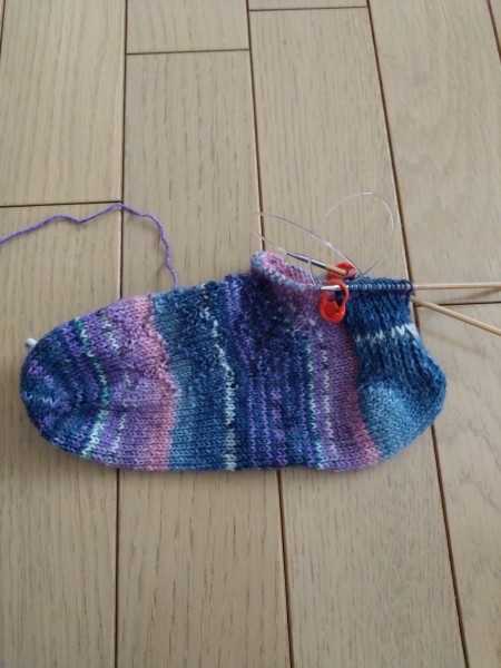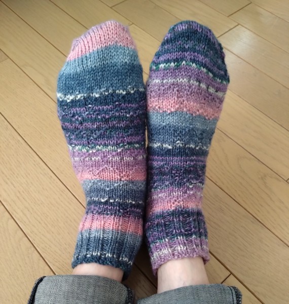 初めてつま先からの編み方に挑戦!しずく堂さんのくつ下。セーターのあまり糸で、左右色の出方が違っても面白いかなと思い気にせずに編んでみました〜時間の出来た時に作成したのでちょっと時間がかかりましたが無事に完成しました!
