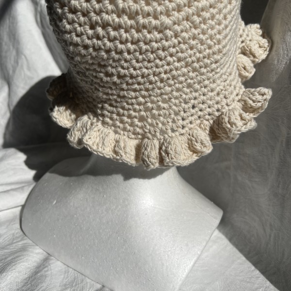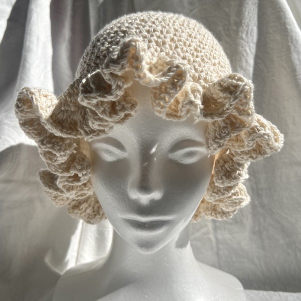 ボリュームのあるフリルが顔周りに出るように編み方を工夫しました。