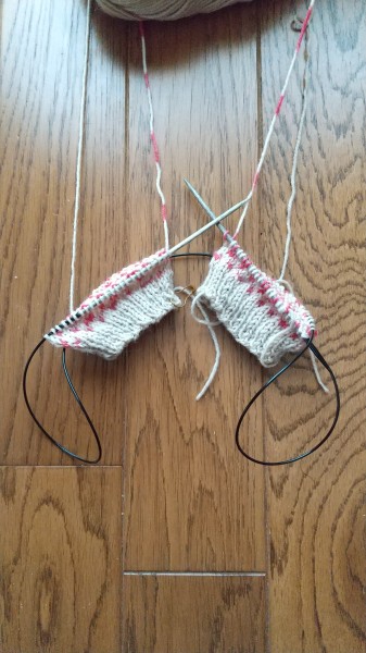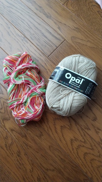 段染め毛糸を外側と内側から出して二つの玉に分けて巻いて、最後カットせずに編み始めたけれど、絡まって編みにくいので結局カットした(^^;