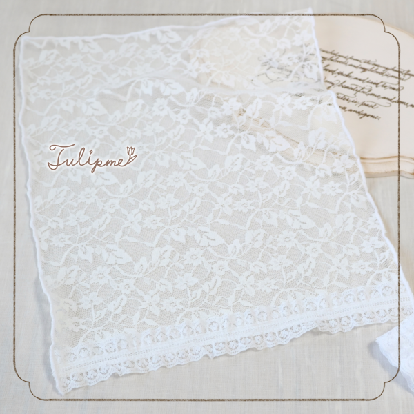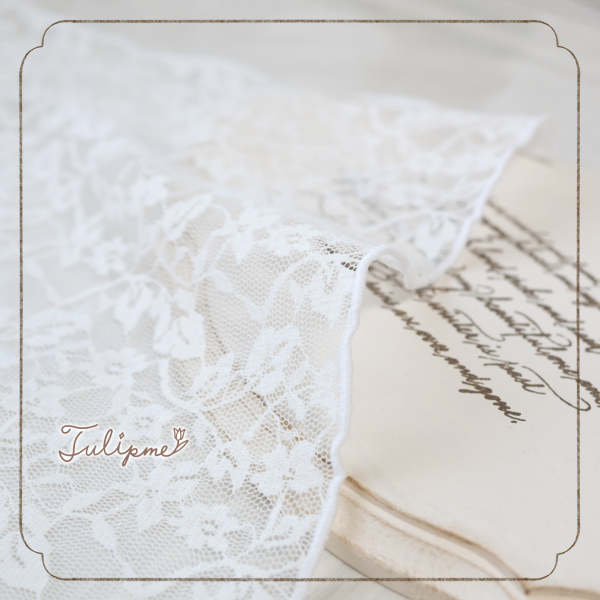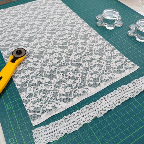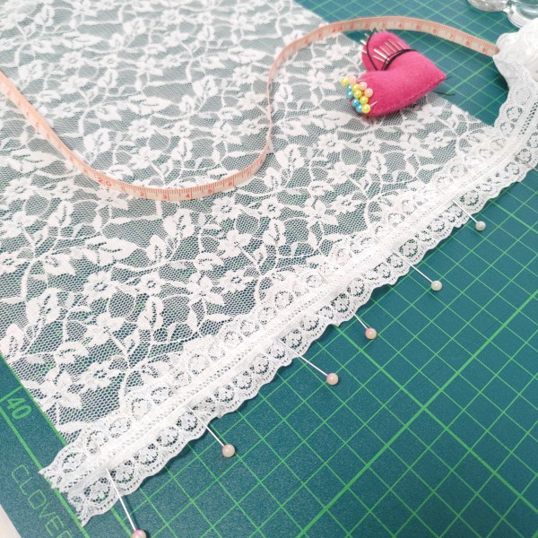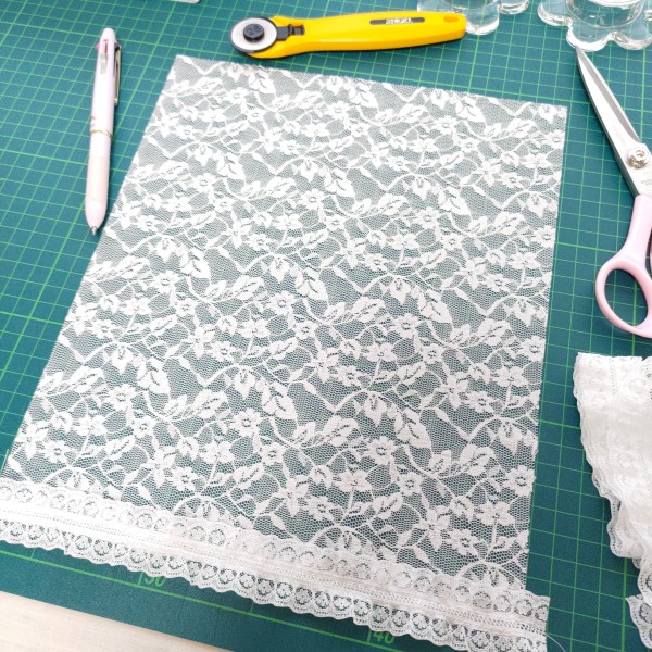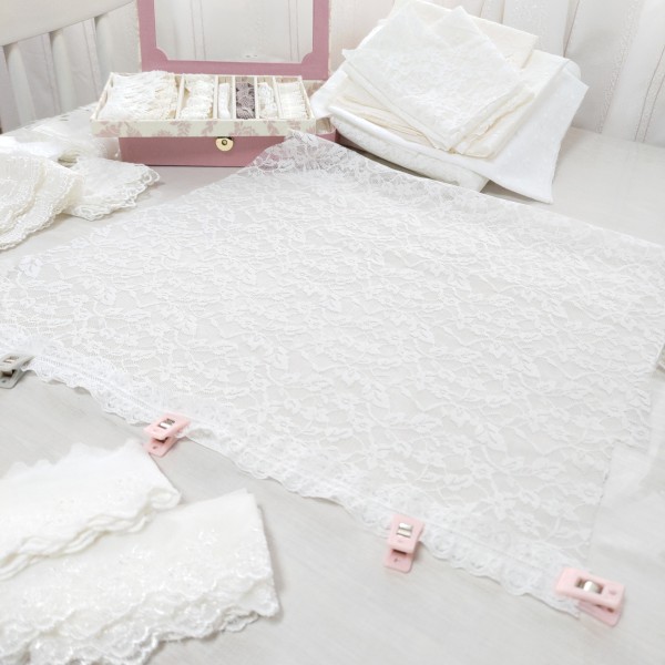 レース生地(コットンラッセルレースというのかな?)と裾に付けるレースを選び中!