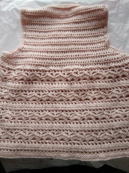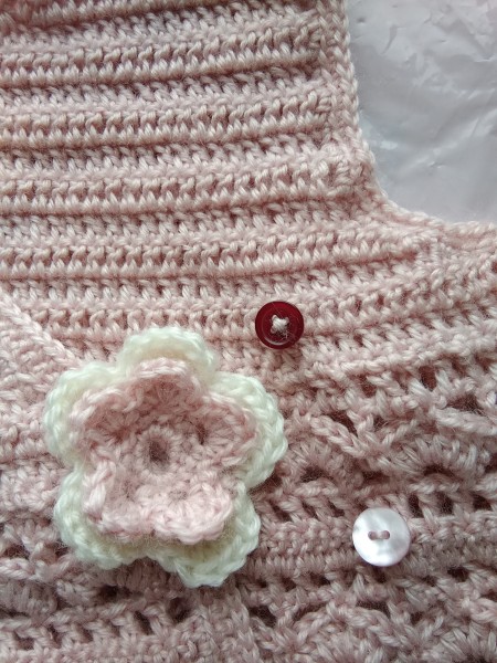 流行り?の、くすみカラーでロングベストを作成 コサージュ中心にボタン穴があります