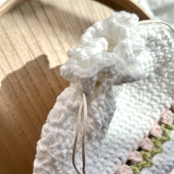 ベルベットのような手触りのTシャツヤーンをメインに、コットン糸で優しいカラーのチューリップの模様編みを入れました。